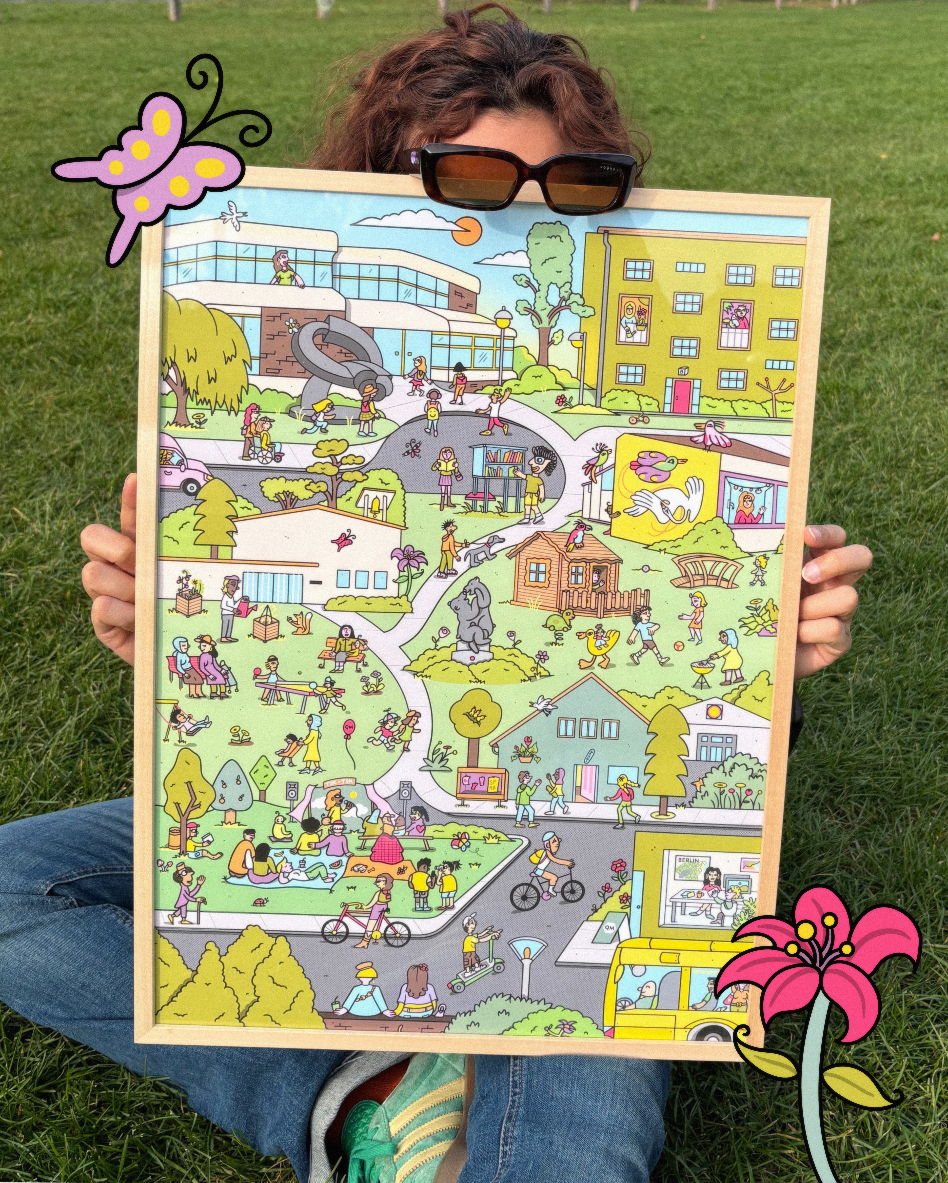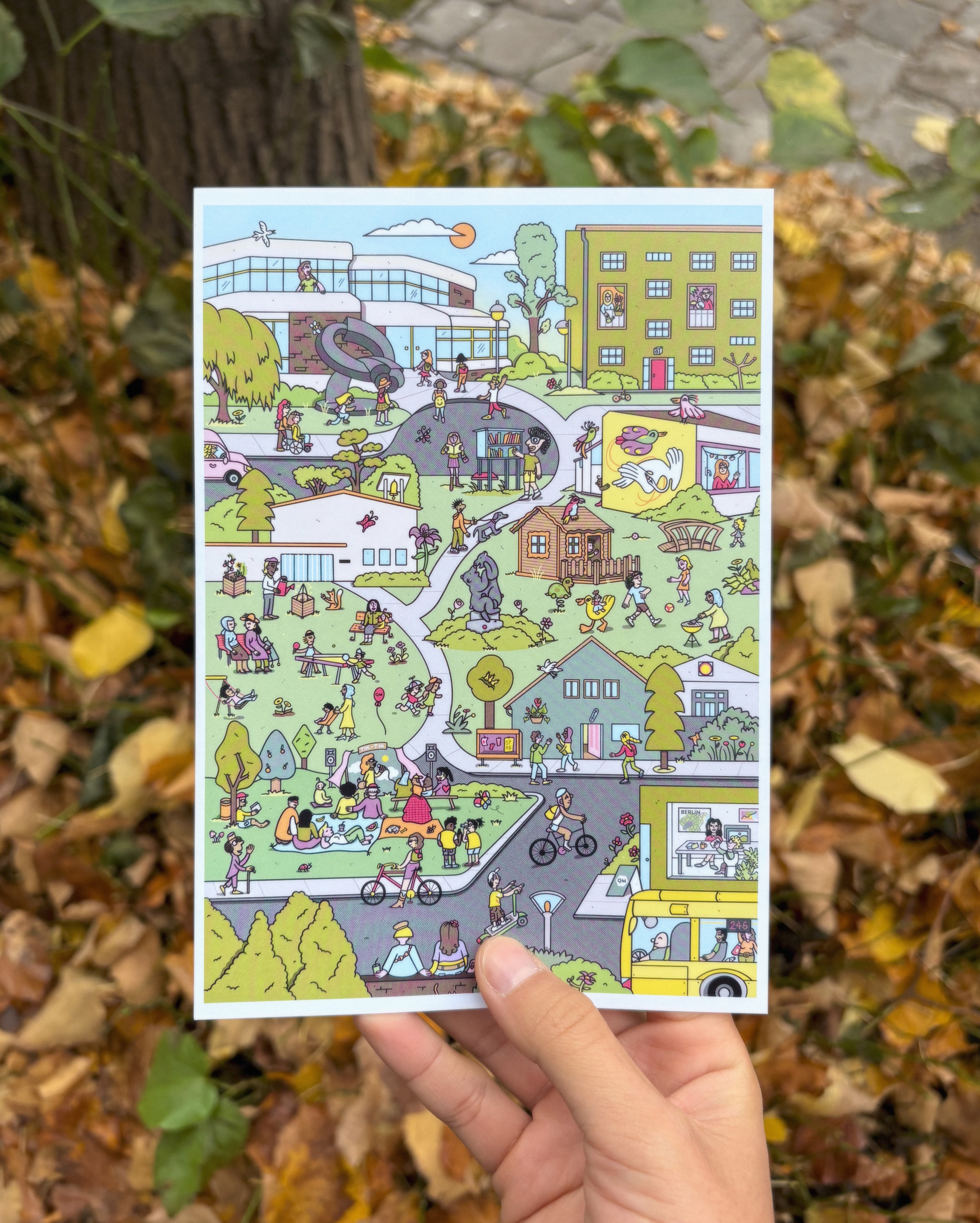 I was commissioned by the Quartier Management of Germaniagarten,Tempelhof-Berlin, to draw the neighborhood for their new campaign aiming to continue to build a strong community. We focused on highlighting educational and cultural activities that neighbors and their families look forward to including their Summer Fest, Theater Group, Kindergarten and School activities. The piece will be used in formats from A2 to A6 as part of their printed and digital communication channels.